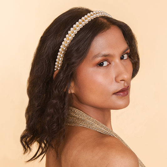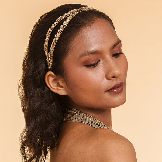 Model Wearing Deepa by Deepa Gurnani Handmade Kadence Headband Gold Color