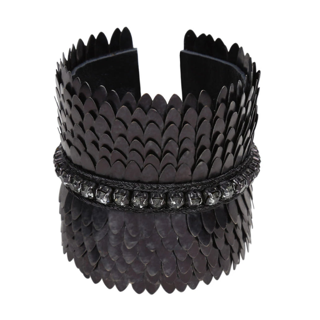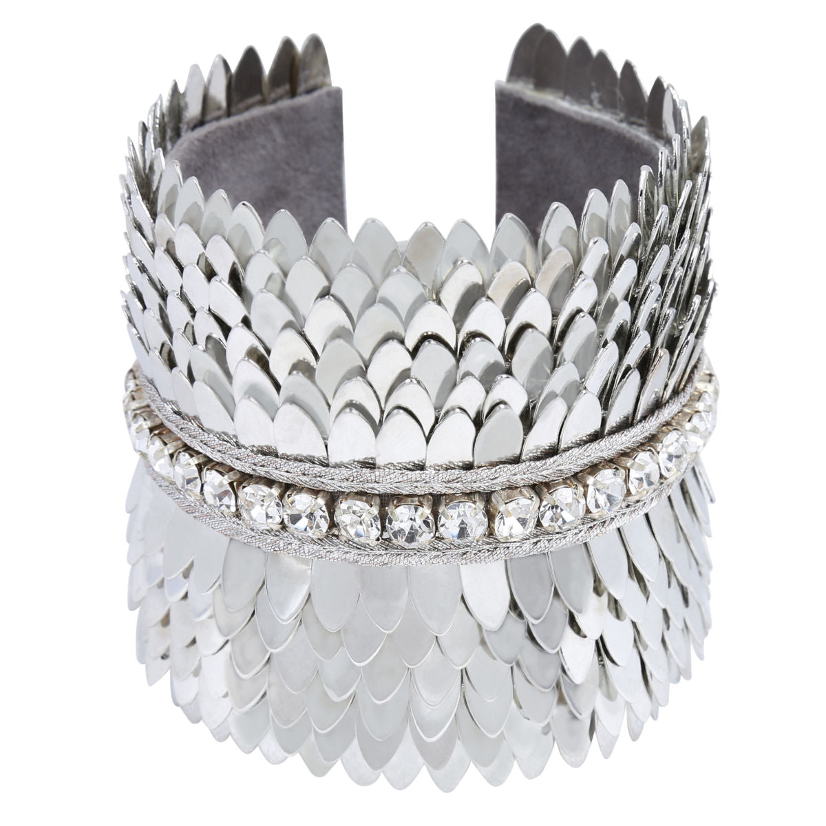 This bold cuff bracelet centered with a line of crystals and clad with tiers of feather-like fringe brings texture to night-out looks.